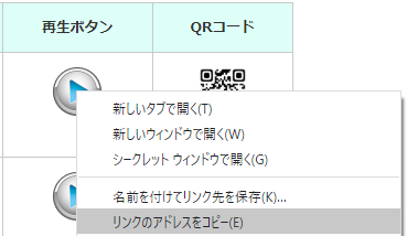 再生ボタンを右クリックして「リンクのアドレスをコピー」を押下またはクリックすると、